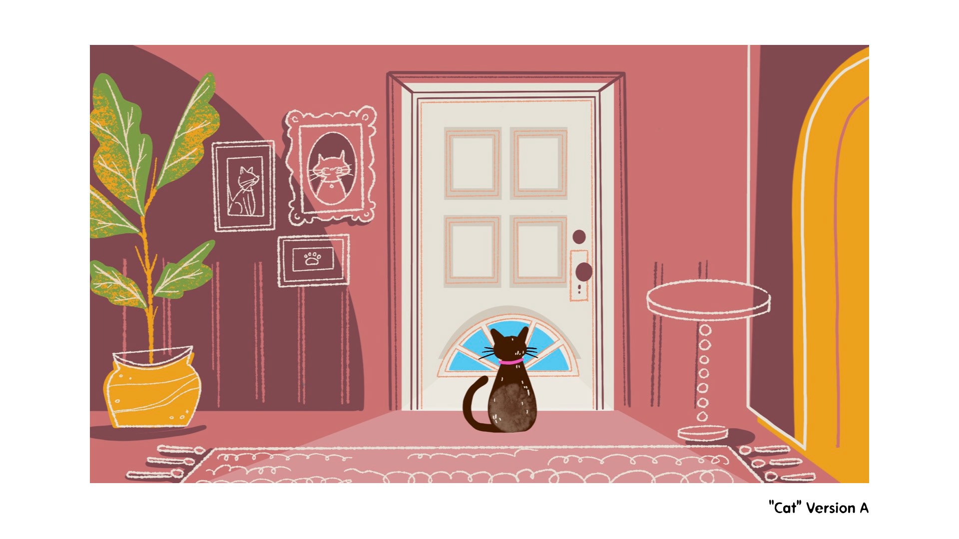 Because there was a fair amount of hand drawn, frame by frame animation in each video, I chose to work in Animate. Animate continues to be my favorite piece of software for animating by hand/without rigs. The animation itself was kept minimal: the cat scratching at the door, the homeowner opening the door for each "expert," the curtains blowing in the wind from the broken window.